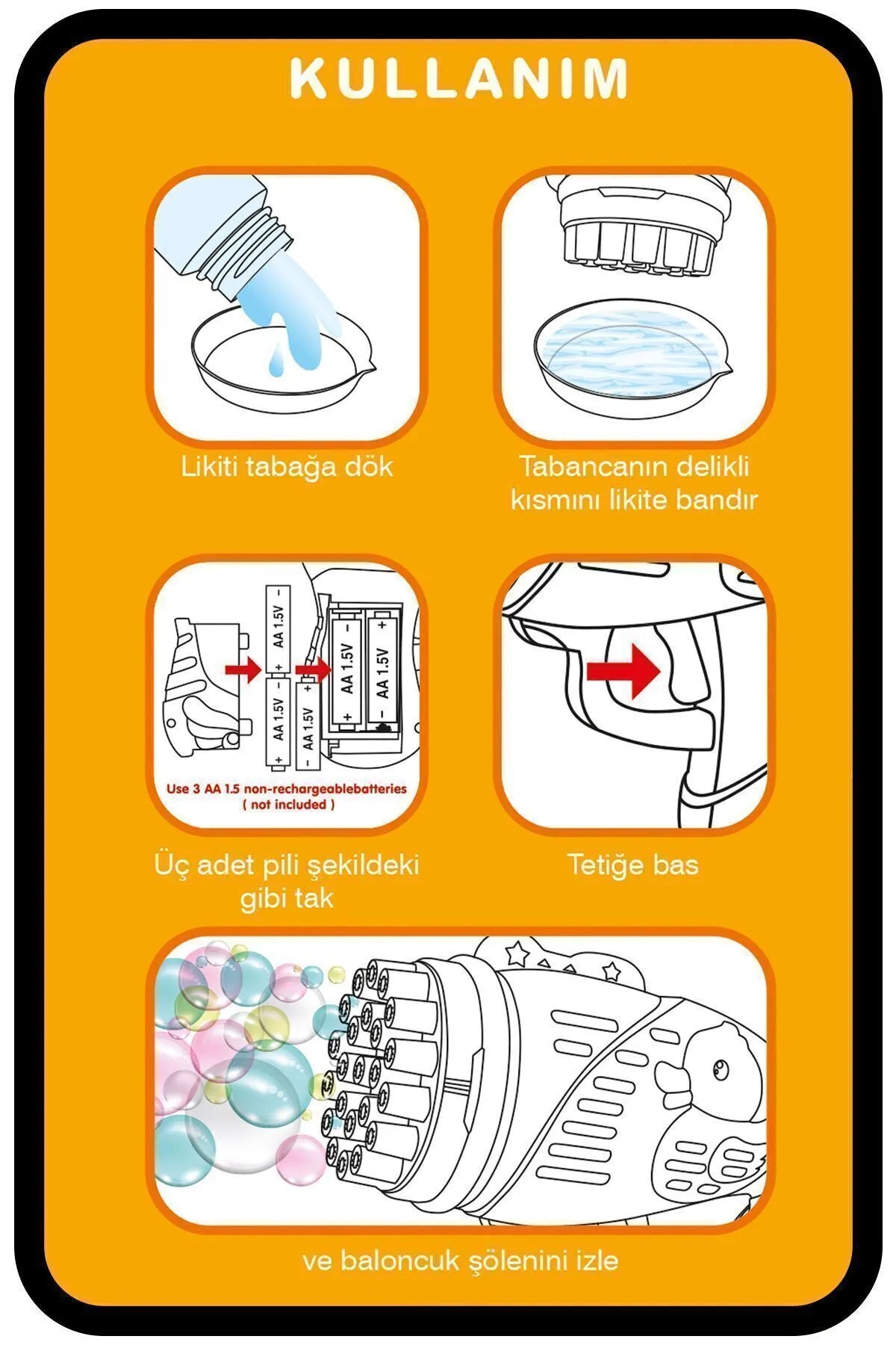 Toksik olmayan köpük sıvısı sayesinde %100 güvenlidir. Sağlam yapısı ve kolay kullanımıyla uzun süreli, güvenli oyun deneyimi sunar.